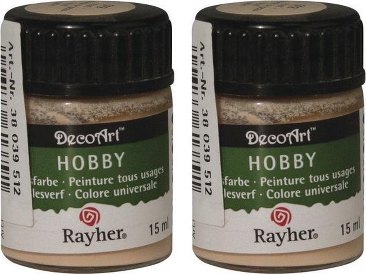 Beige acrylverf/allesverf potje 15 ml hobby/knutselmateriaal. Een klein potje beige acrylverf met een inhoud van ongeveer 15 ml. Een goed dekkende acrylverf die, naar wens, waterverdunbaar is. Des te minder water u toevoegt, des te dikker en dekkender de verf blijft. Geschikt voor bijna alle ondergronden. Ideaal om bijvoorbeeld piepschuim, hout, papier mache of plastic/kunststof mee te beschilderen. De verf heeft een matte finish. Aantal potjes: 2. Formaat per potje: diameter 2,5 cm, hoogte 4 cm. Inhoud per potje: 15 ml. Materiaal verpakking: kunststof. Kleur: mat beige. Hobbyverf schildermateriaal voor DIY hobbyprojecten/knutselprojecten. Knutselmateriaal allesverf. Surprises maken basismateriaal.