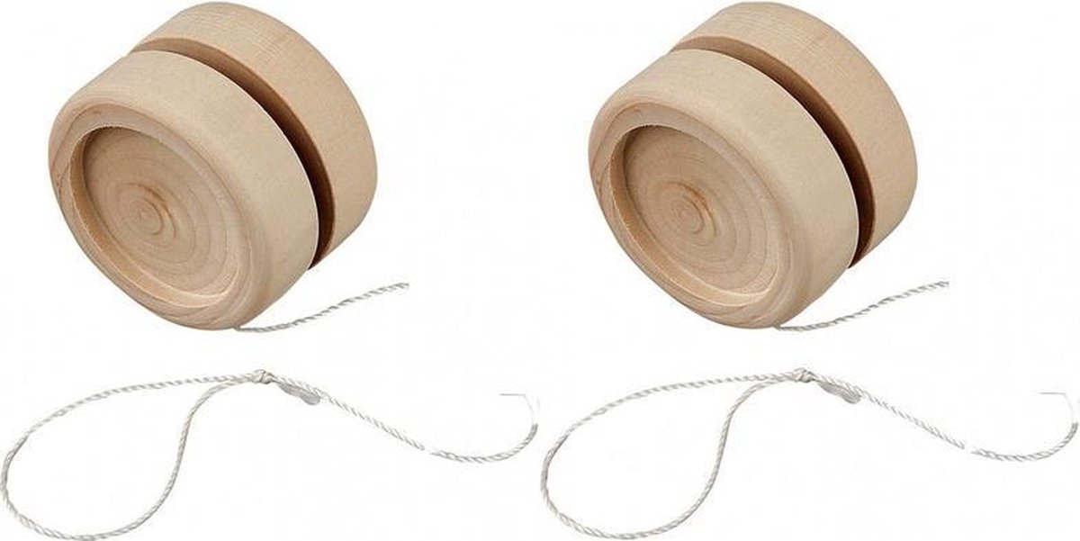 2x Jojo met wit touwtje, gemaakt van hout. Afmeting: ca. D5 x H3 cm. Doordat het hout onbehandeld is kunt u de jojo goed schilderen en/of versieren. Leuk voor bijvoorbeeld kinderfeestjes/kinderpartijtjes! U ontvangt 2 stuks. DIY knutselmateriaal/hobbymateriaal houten jojo om te versieren.