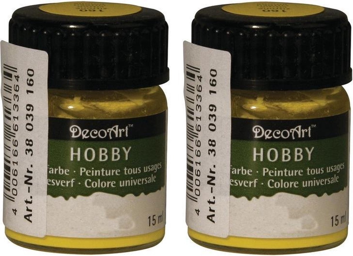 Gele acrylverf/allesverf potje 15 ml hobby/knutselmateriaal. Een klein potje witte acrylverf met een inhoud van ongeveer 15 ml. Een goed dekkende acrylverf die, naar wens, waterverdunbaar is. Des te minder water u toevoegt, des te dikker en dekkender de verf blijft. Geschikt voor bijna alle ondergronden. Ideaal om bijvoorbeeld piepschuim, hout, papier mache of plastic/kunststof mee te beschilderen. De verf heeft een matte finish. Aantal potjes: 2. Formaat per potje: diameter 2,5 cm, hoogte 4 cm. Inhoud per potje: 15 ml. Materiaal verpakking: kunststof. Kleur: mat geel. Hobbyverf schildermateriaal voor DIY hobbyprojecten/knutselprojecten. Knutselmateriaal allesverf. Surprises maken basismateriaal.