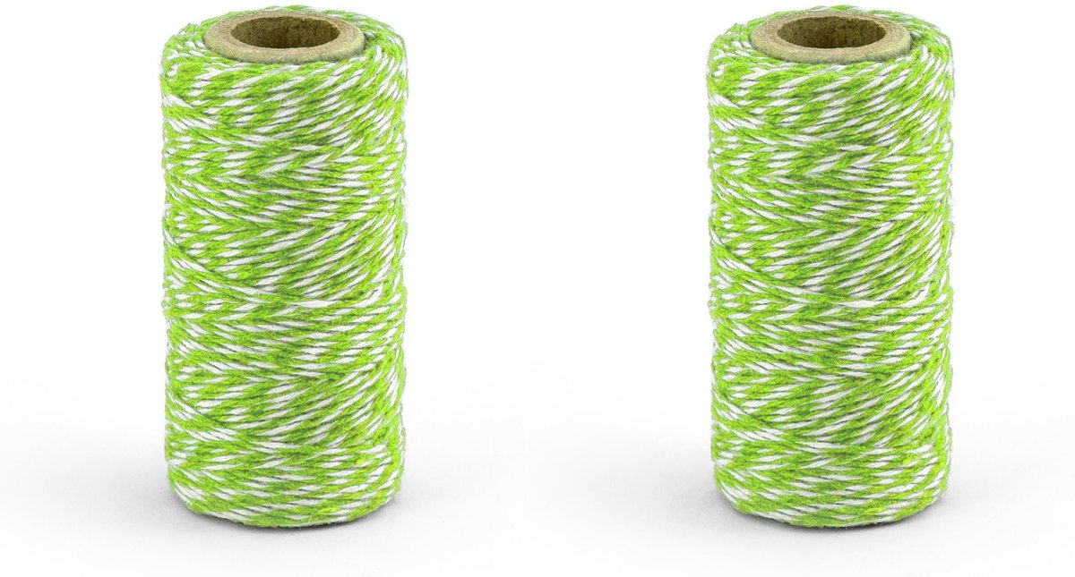2x Groen/wit bakkerstouw 50 meter hobby materiaal. Groen/wit touw op rol. Het groen/witte touw is ook wel bekend als bakkerstouw, baktouw, slagerstouw, bindtouw of keukentouw. Materiaal touw: 100% katoen, kokertje: karton. Toepassing: cadeautjes verpakken, geschenken inpakken, traktaties maken. Aantal: 2x. Bakers twine hobbymateriaal cadeauverpakkingen cadeaulint.