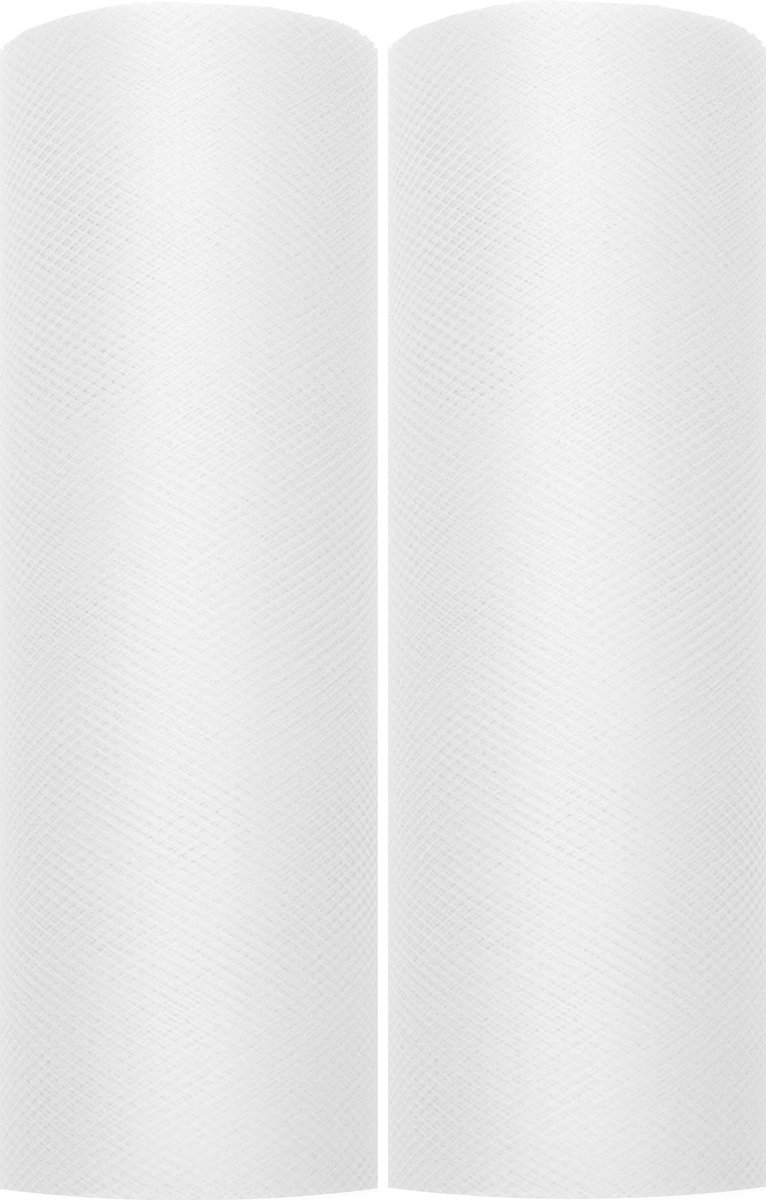 2x Hobby/decoratie witte tulestofjes op rol 15 cm x 9 meter. Wit mesh tule stofjes op rol. Tulestof is een gaatjesstof en heeft daardoor een doorzichtig effect. Materiaal: polyester. Formaat lint: 15 cm breed, in totaal 9 meter lang. Op de afbeelding worden 2 rolletjes tule getoond, in werkelijkheid kun je meer door de stof heen kijken. Hobbymateriaal benodigdheden tule gaatjesstof stoffen voor het maken van kleding en decoraties of het verpakken van cadeautjes. Cadeauverpakkingen cadeaulinten/ribbons tule verpakkingsmaterialen. U ontvangt 2 rollen.