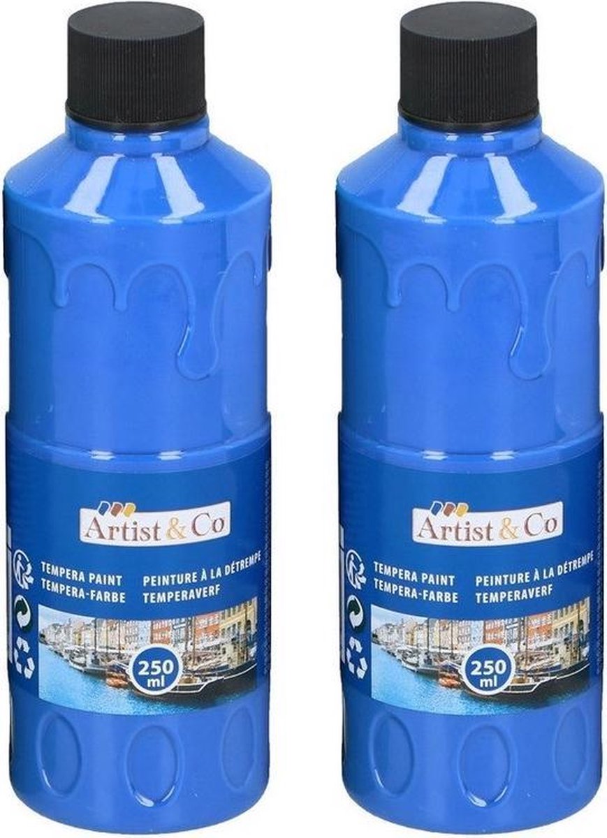 2x Acrylverf / temperaverf blauw 250 ml. 2x blauwe acrylverf, in een fles met een inhoud van 250 ml. Acrylverf heeft een korte droogtijd en is geschikt voor o.a. papier, canvas, hout en aardewerk. De verf is op waterbasis, maar na droging watervast. Hobby/knutselmateriaal schilderen met acrylverf, temperaverf. U ontvangt 2x fles(sen).