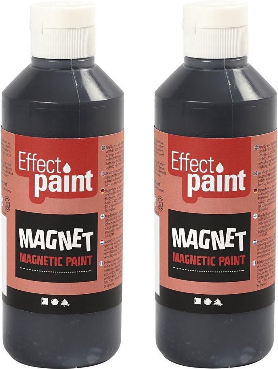 2x Magneetverf zwart 250 ml. Maak gemakkelijk een magneetbord van o.a deuren en muren. Deze magnetische verf maakt van elke gewenst oppervlak een magneet. Een minimum van 3 lagen wordt aangeraden en de verf moet tussen de lagen door minimaal 24 uur drogen. Met 1 fles magnetische verf kan ca. 1 - 2 vierkante meter worden geschilderd, u ontvangt in totaal 2 flessen. Inhoud: 250 ml. Kleur: zwart. Hobby/verf materiaal.