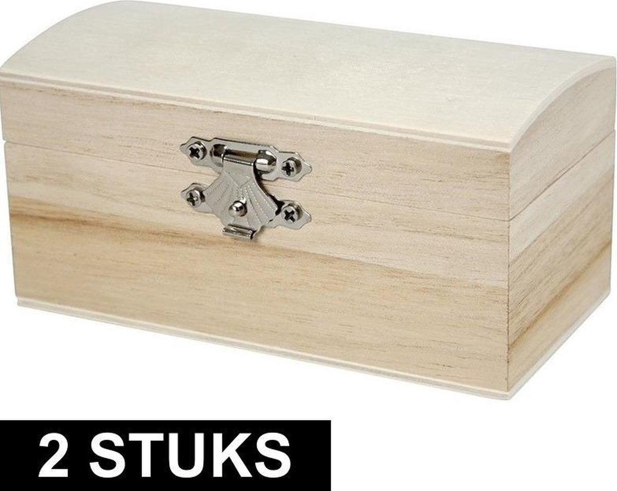 2x Een blanco houten kistje met ronde deksel en metalen sluiting, om zelf te versieren/schilderen. Het kistje heeft een afmeting van ca. 11,5 x 5,8 x 5,8 cm en een binnenmaat van ca. 10 x 4,3 x 3,6 cm.