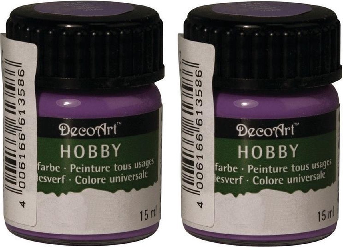 Paarse acrylverf/allesverf potje 15 ml hobby/knutselmateriaal. Een klein potje paarse acrylverf met een inhoud van ongeveer 15 ml. Een goed dekkende acrylverf die, naar wens, waterverdunbaar is. Des te minder water u toevoegt, des te dikker en dekkender de verf blijft. Geschikt voor bijna alle ondergronden. Ideaal om bijvoorbeeld piepschuim, hout, papier mache of plastic/kunststof mee te beschilderen. De verf heeft een matte finish. Aantal potjes: 2. Formaat per potje: diameter 2,5 cm, hoogte 4 cm. Inhoud per potje: 15 ml. Materiaal verpakking: kunststof. Kleur: mat paars. Hobbyverf schildermateriaal voor DIY hobbyprojecten/knutselprojecten. Knutselmateriaal allesverf. Surprises maken basismateriaal.