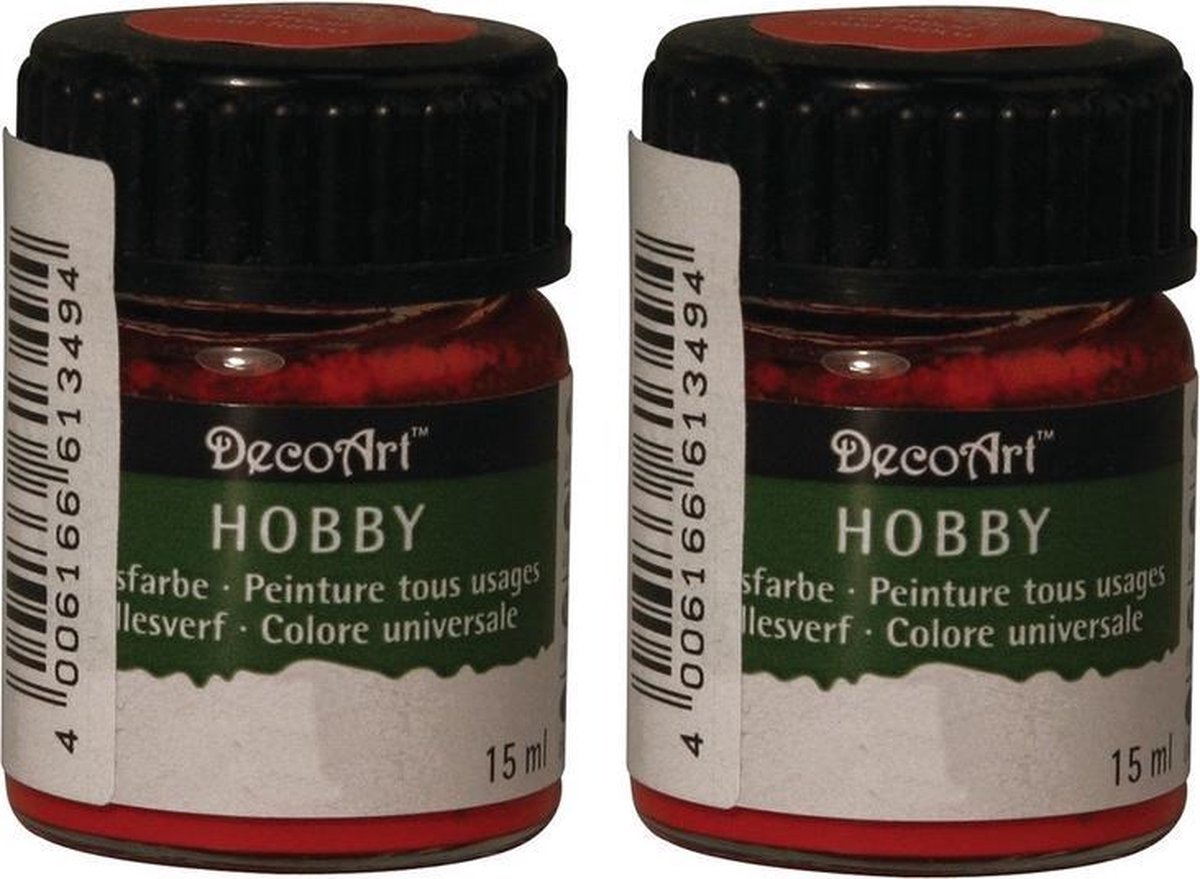 Rode acrylverf/allesverf potje 15 ml hobby/knutselmateriaal. Een klein potje rode acrylverf met een inhoud van ongeveer 15 ml. Een goed dekkende acrylverf die, naar wens, waterverdunbaar is. Des te minder water u toevoegt, des te dikker en dekkender de verf blijft. Geschikt voor bijna alle ondergronden. Ideaal om bijvoorbeeld piepschuim, hout, papier mache of plastic/kunststof mee te beschilderen. De verf heeft een matte finish. Aantal potjes: 2. Formaat per potje: diameter 2,5 cm, hoogte 4 cm. Inhoud per potje: 15 ml. Materiaal verpakking: kunststof. Kleur: mat rood. Hobbyverf schildermateriaal voor DIY hobbyprojecten/knutselprojecten. Knutselmateriaal allesverf. Surprises maken basismateriaal.