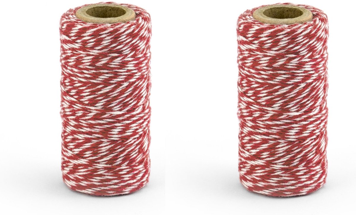 2x Rood/wit bakkerstouw 50 meter hobby materiaal. Rood/wit touw op rol. Het rood/witte touw is ook wel bekend als bakkerstouw, baktouw, slagerstouw, bindtouw of keukentouw. Materiaal touw: 100% katoen, kokertje: karton. Toepassing: cadeautjes verpakken, geschenken inpakken, traktaties maken. Aantal: 2x. Bakers twine hobbymateriaal cadeauverpakkingen cadeaulint.