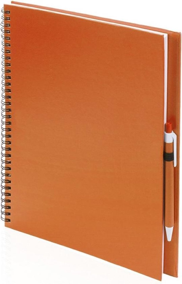 Schetsboeken/Tekeningen maken luxe blok met 80x vellen wit papier met harde oranje kaft en spiraal binding. De tekenboeken zijn inclusief een bijpassende pennen. De afmetingen zijn ongeveer 21 x 29 x 2 centimeter. Formaat: A4 papier. Super de luxe schetsboeken/opschrijfblokken/notitieblokken voor kinderen en volwassenen. U ontvangt 2 schetsboeken.