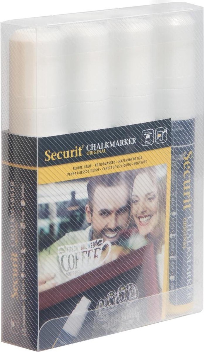 Met brede punt van 7-15 mm. Deze krijtmarker loopt niet uit, verkleurt niet en is bestand tegen lichte regen. Geschikt voor krijtborden, glas, spiegel, etc. Verwijderbaar met een spons en water.\\n\\nwit, blister met 4 stuks