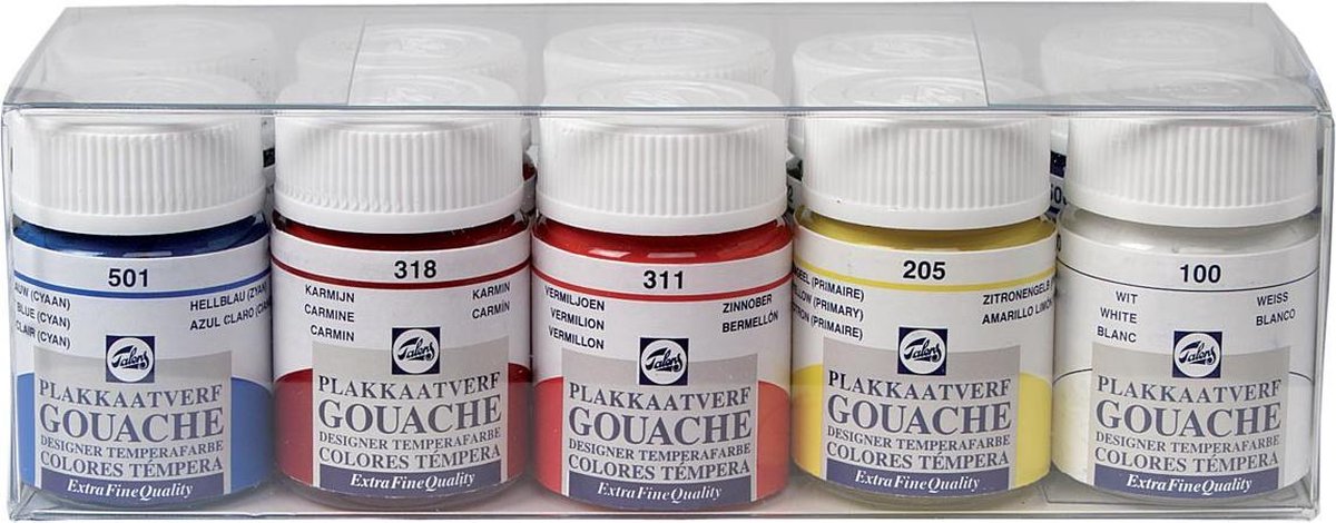 Flacon van 16 ml. Dekkende en hoog gepigmenteerde verf met water verdunbaar. Droogt binnen enkele minuten. Ideaal om te schilderen op streeploze en matte oppervlakken. Hecht op iedere vetvrije en poreuze ondergrond zoals papier, karton, maar ook op hout, gips en aardewerk.\\n\\n10 geassorteerde kleuren (wit, citroengeel, gele oker, vermiljoen, karmijn, Sienna gebrand, lichtblauw (cyaan), ultramarijn donker, donkergroen en neutraal zwart)