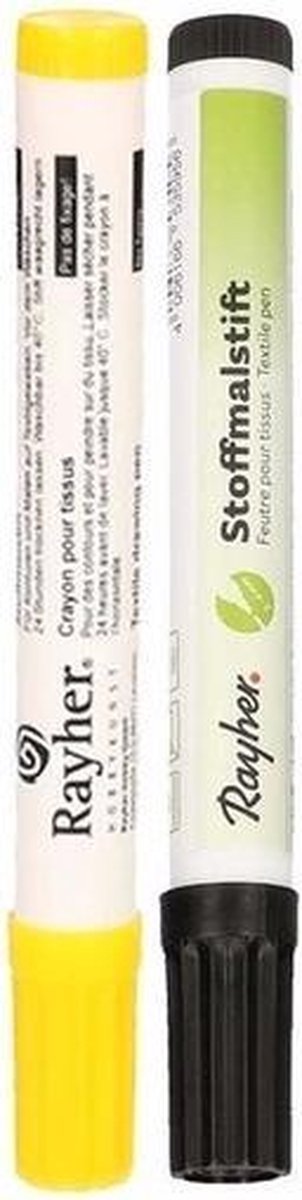 Setje textielstiften met dikke punt. In een setje zitten 2 stuks textielstiften. Kleuren zwart en geel. Met deze stiften kunt u op uw shirt tekenen en schrijven. Schrijven, laten drogen en klaar om te dragen! bestaande uit 1x Zwarte textielstift met dikke punt 2-4 mm, 1x Gele textielstift met dikke punt