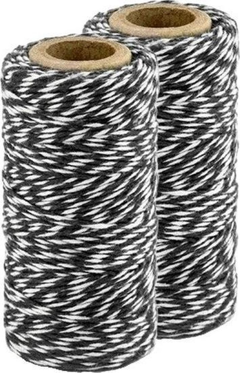 2x Zwart/wit bakkerstouw 50 meter hobby materiaal. Een rolletje met zwart/wit touw. Het zwarte/wittw touw is ook wel bekend als bakkerstouw, baktouw, slagerstouw, bindtouw of keukentouw. Materiaal touw: 100% katoen, kokertje: karton. Toepassing: cadeautjes verpakken, geschenken inpakken, traktaties maken. Bakers twine hobbymateriaal cadeauverpakkingen cadeaulint. U ontvangt 2 rolletjes met op elk rolletje 50 meter touw.