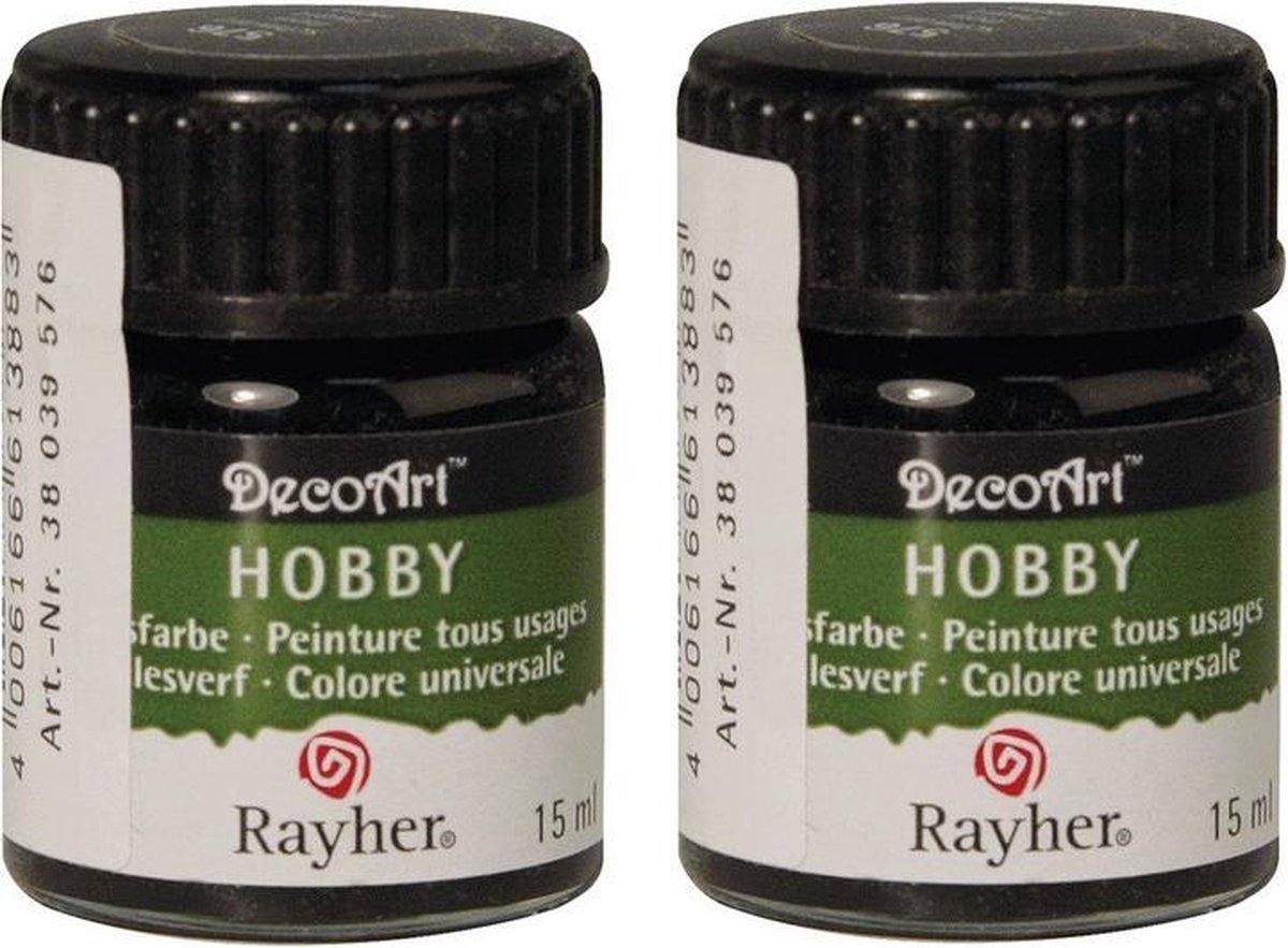 Zwarte acrylverf/allesverf potje 15 ml hobby/knutselmateriaal. Een klein potje zwarte acrylverf met een inhoud van ongeveer 15 ml. Een goed dekkende acrylverf die, naar wens, waterverdunbaar is. Des te minder water u toevoegt, des te dikker en dekkender de verf blijft. Geschikt voor bijna alle ondergronden. Ideaal om bijvoorbeeld piepschuim, hout, papier mache of plastic/kunststof mee te beschilderen. De verf heeft een matte finish. Aantal potjes: 2. Formaat per potje: diameter 2,5 cm, hoogte 4 cm. Inhoud per potje: 15 ml. Materiaal verpakking: kunststof. Kleur: mat zwart. Hobbyverf schildermateriaal voor DIY hobbyprojecten/knutselprojecten. Knutselmateriaal allesverf. Surprises maken basismateriaal.