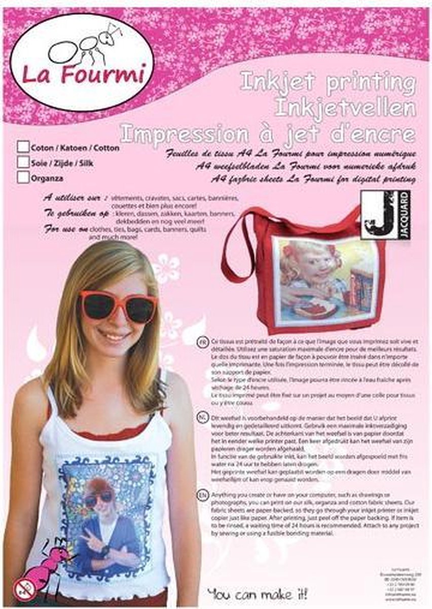 3 vellen Pongé zijde 10 voor printer (A4) Inkjetvellen ! Dit weefsel is voorbehandeld op de manier dat het beeld dat U afprint levendig en gedetailleerd uitkomt. Gebruik een maximale inktverzadiging voor beter resultaat. De achterkant van het weefsel is van papier doordat het in eender welke printer past. Een keer afgedrukt kan het weefsel van zijn papieren drager worden afgehaald. In functie van de gebruikte inkt, kan het beeld worden afgespoeld met fris water na 24 uur te hebben laten drogen. Het geprinte weefsel kan geplaatst worden op een dragen door middel van weefsellijm of kan erop genaaid worden.