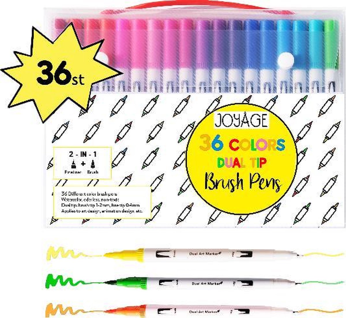 Elke pen van het merk Joyage beschikt over een dunne Fineliner én een dikke Brush Pen dus eigenlijk heeft u 72 stiften. UITGEBREID AANBOD - U beschikt over maar liefst 36 verschillende kleuren, waarvan telkens een Brush pen en een Fineliner. Dit maakt Your Adventure Fineliners tot het meest uitgebreide aanbod op Bol.com. FLEXIBELE PENSEELPUNT – Deze innovatieve Brush stiften hebben een dunne, flexibele penseelpunt van zachte haartjes. Met een soepele beweging maak je dikke en dunne lijnen die vloeiend in elkaar overlopen. Gebruik de Fineliners voor het éxtra fijne werk. GARANTIE – Wij vinden het belangrijk dat u tevreden bent met uw aankoop. Bent u niet tevreden? Wij hebben een 30-dagen niet goed, geld terug garantie vanaf de ontvangstdatum.