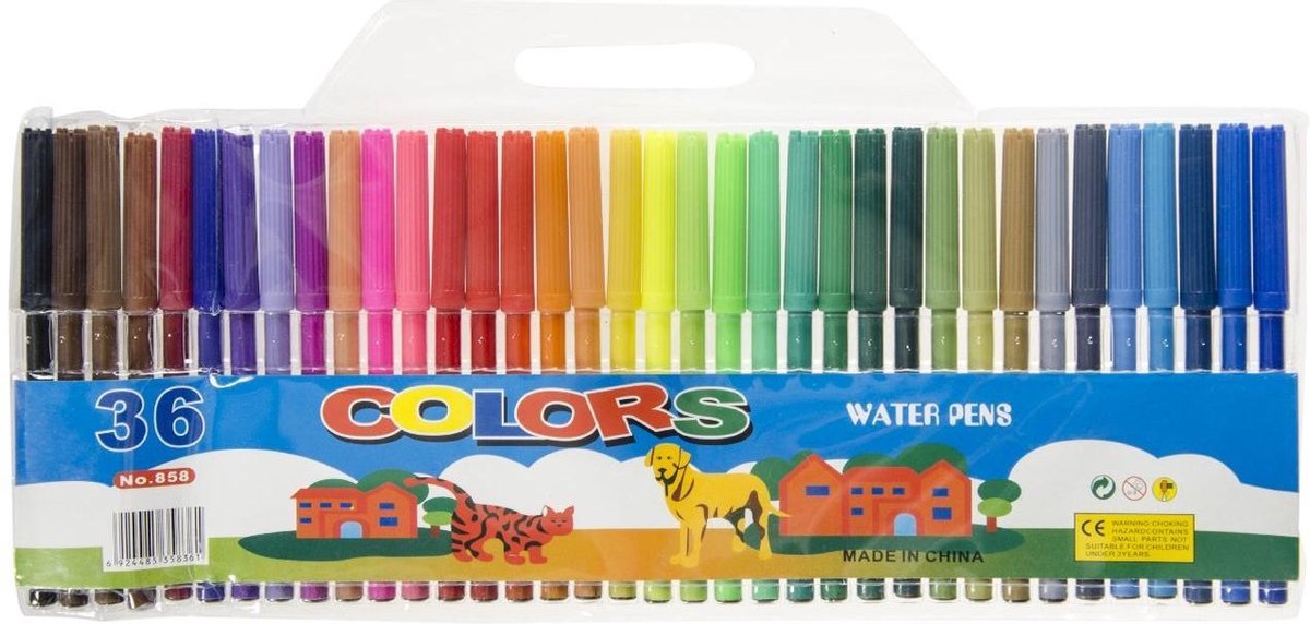 Een set van 36x gekleurde viltstiften. De plastic stiften worden geleverd in een plastic mapje. In de set zitten 36 verschillende kleuren. Eventuele stiftvlekken zijn te verwijderen bij 40 graden wassen. Afmeting etui: 16 x 36 x 1 cm. Kleuren creatief speelgoed voor kinderen.