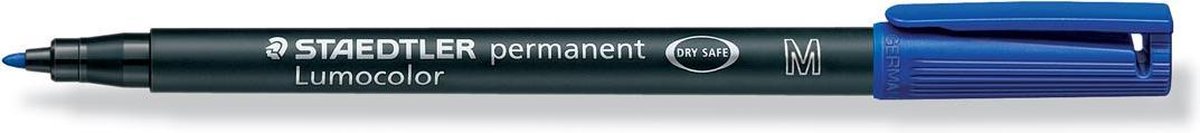 Watervaste stiften voor o.a. retroprojectie. De inkt is ontworpen om op nagenoeg alle gladde oppervlakken te schrijven: plastic, glas, porselein, diepvrieszakjes, OHP-transparanten, CD's/DVD's, enz.'Dry safe ink' technologie: kan tot 2 weken openliggen zonder uit te drogen.\\n\\nblauw, medium 1 mm