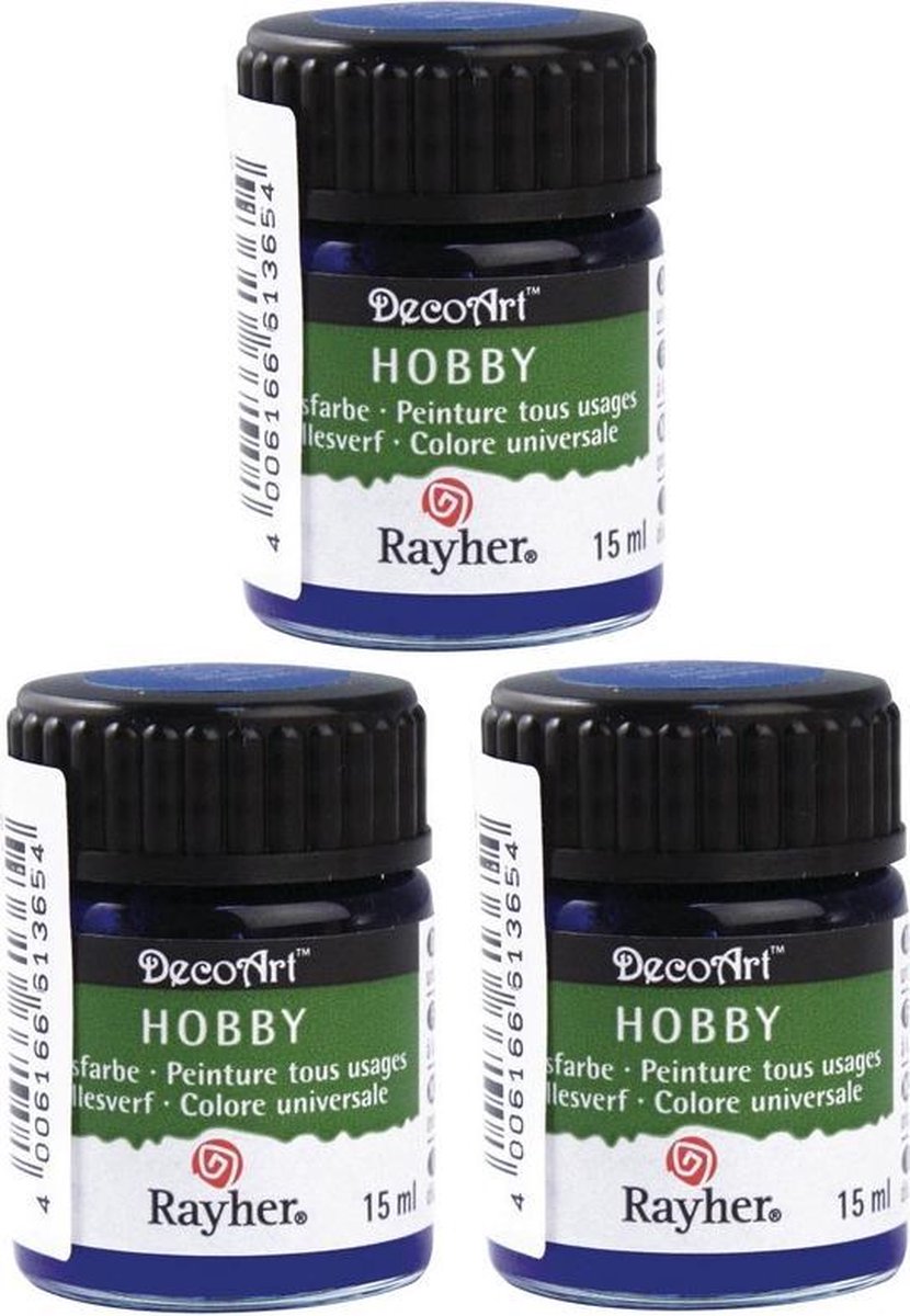 Blauwe acrylverf/allesverf potje 15 ml hobby/knutselmateriaal. Een klein potje blauwe acrylverf met een inhoud van ongeveer 15 ml. Een goed dekkende acrylverf die, naar wens, waterverdunbaar is. Des te minder water u toevoegt, des te dikker en dekkender de verf blijft. Geschikt voor bijna alle ondergronden. Ideaal om bijvoorbeeld piepschuim, hout, papier mache of plastic/kunststof mee te beschilderen. De verf heeft een matte finish. Aantal potjes: 3. Formaat per potje: diameter 2,5 cm, hoogte 4 cm. Inhoud per potje: 15 ml. Materiaal verpakking: kunststof. Kleur: mat blauw. Hobbyverf schildermateriaal voor DIY hobbyprojecten/knutselprojecten. Knutselmateriaal allesverf. Surprises maken basismateriaal.