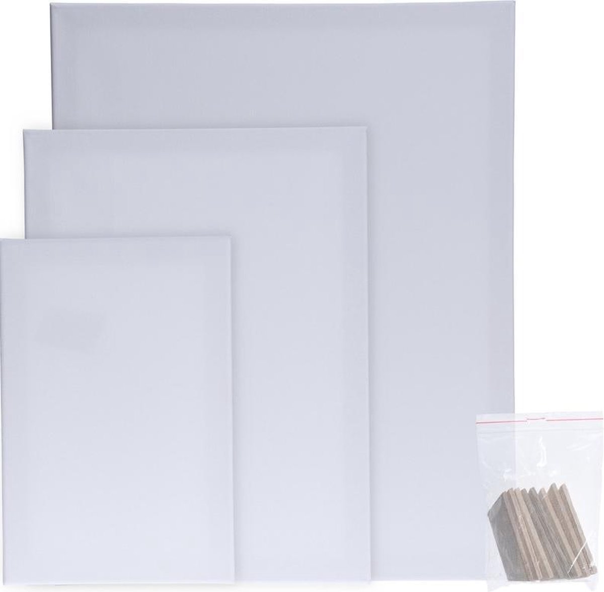 Een set met 3 rechthoekige canvasdoeken/schildersdoeken. Geschikt voor olieverf en acrylverf. Afmetingen: 20 x 30 cm, 30 x 40 cm en 40 x 50 cm. Materiaal: canvas/hout. Hobby/knutselmateriaal - Schilderbenodigdheden canvas/schilderij doeken schilderen.