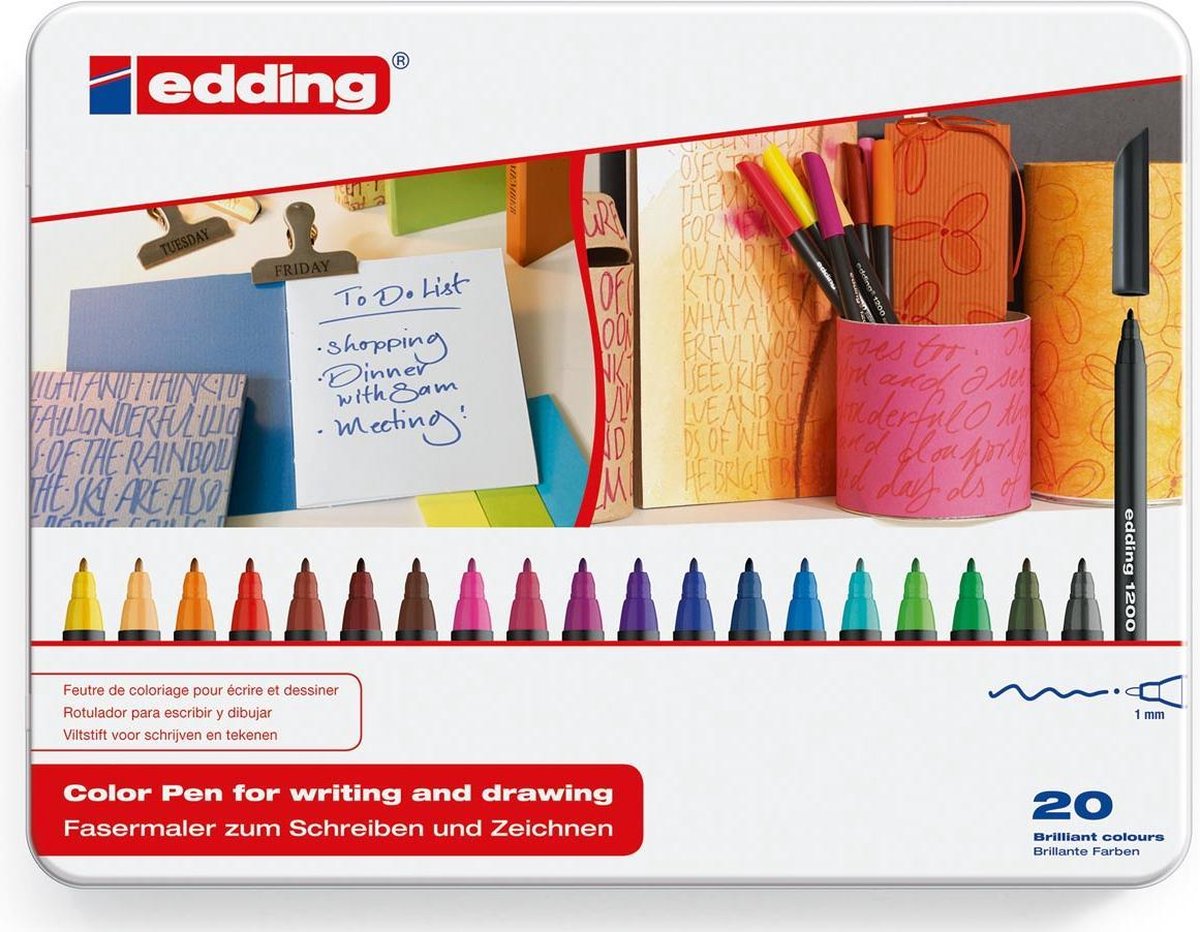 Tekenstift, ronde punt met een schrijfdikte van +/- 1 mm. Om te schrijven, tekenen, illustreren, enz. Inkt op waterbasis, lichtbestendig.\\n\\n20 stiften in geassorteerde kleuren in een metalen doos