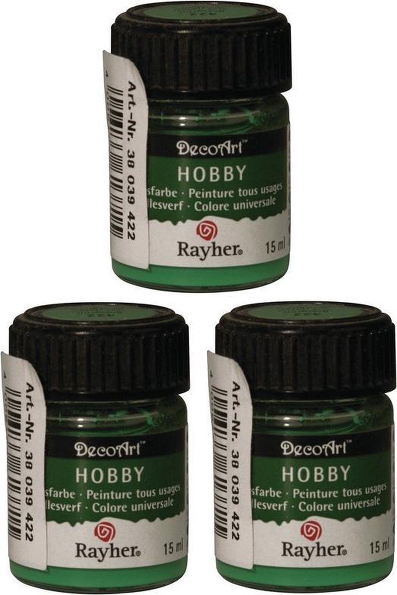Groene acrylverf/allesverf potje 15 ml hobby/knutselmateriaal. Een klein potje groene acrylverf met een inhoud van ongeveer 15 ml. Een goed dekkende acrylverf die, naar wens, waterverdunbaar is. Des te minder water u toevoegt, des te dikker en dekkender de verf blijft. Geschikt voor bijna alle ondergronden. Ideaal om bijvoorbeeld piepschuim, hout, papier mache of plastic/kunststof mee te beschilderen. De verf heeft een matte finish. Aantal potjes: 3. Formaat per potje: diameter 2,5 cm, hoogte 4 cm. Inhoud per potje: 15 ml. Materiaal verpakking: kunststof. Kleur: mat groen. Hobbyverf schildermateriaal voor DIY hobbyprojecten/knutselprojecten. Knutselmateriaal allesverf. Surprises maken basismateriaal.