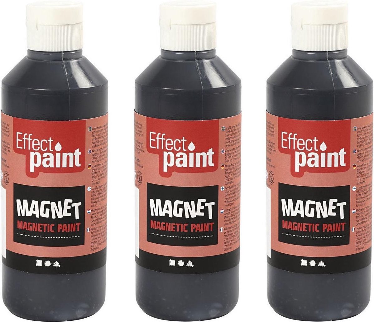 3x Magneetverf zwart 250 ml. Maak gemakkelijk een magneetbord van o.a deuren en muren. Deze magnetische verf maakt van elke gewenst oppervlak een magneet. Een minimum van 3 lagen wordt aangeraden en de verf moet tussen de lagen door minimaal 24 uur drogen. Met 1 fles magnetische verf kan ca. 1 - 2 vierkante meter worden geschilderd, u ontvangt in totaal 3 flessen. Inhoud per fles: 250 ml. Kleur: zwart. Hobby/verf materiaal.