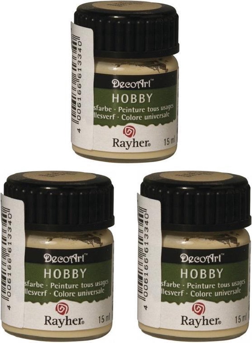 Ivoor witte acrylverf/allesverf potje 15 ml hobby/knutselmateriaal. Een klein potje ivoor witte acrylverf met een inhoud van ongeveer 15 ml. Een goed dekkende acrylverf die, naar wens, waterverdunbaar is. Des te minder water u toevoegt, des te dikker en dekkender de verf blijft. Geschikt voor bijna alle ondergronden. Ideaal om bijvoorbeeld piepschuim, hout, papier mache of plastic/kunststof mee te beschilderen. De verf heeft een matte finish. Aantal potjes: 3. Formaat per potje: diameter 2,5 cm, hoogte 4 cm. Inhoud per potje: 15 ml. Materiaal verpakking: kunststof. Kleur: mat ivoor wit. Hobbyverf schildermateriaal voor DIY hobbyprojecten/knutselprojecten. Knutselmateriaal allesverf. Surprises maken basismateriaal.