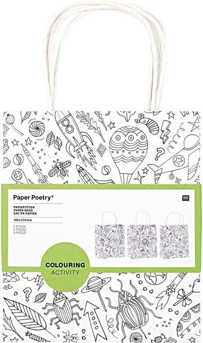 Een pak met 3 papieren tassen/tasjes (250 grams), om zelf in te kleuren. Opdrukken van o.a. insecten, aliens en vliegtuigen. De afbeeldingen varieren van 1 tot 5 cm. Afmeting tas: 18 x 21 cm. Leuk om kinderen mee te laten knutselen op een kinderfeestje/verjaardagspartijtje! Hobbymateriaal/knutselmateriaal diy tassen/tasjes kleuren voor kinderen/jongens/meisjes.
