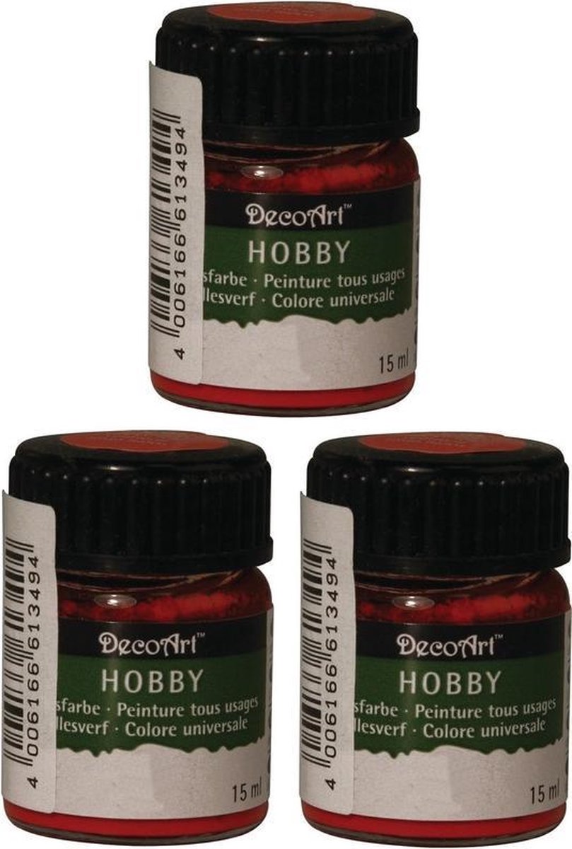 Rode acrylverf/allesverf potje 15 ml hobby/knutselmateriaal. Een klein potje rode acrylverf met een inhoud van ongeveer 15 ml. Een goed dekkende acrylverf die, naar wens, waterverdunbaar is. Des te minder water u toevoegt, des te dikker en dekkender de verf blijft. Geschikt voor bijna alle ondergronden. Ideaal om bijvoorbeeld piepschuim, hout, papier mache of plastic/kunststof mee te beschilderen. De verf heeft een matte finish. Aantal potjes: 3. Formaat per potje: diameter 2,5 cm, hoogte 4 cm. Inhoud per potje: 15 ml. Materiaal verpakking: kunststof. Kleur: mat rood. Hobbyverf schildermateriaal voor DIY hobbyprojecten/knutselprojecten. Knutselmateriaal allesverf. Surprises maken basismateriaal.