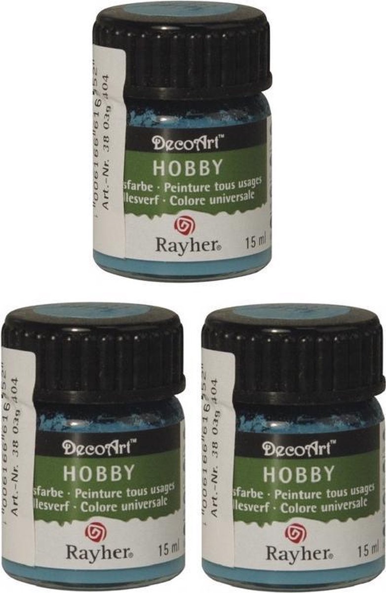 Turquoise blauwe acrylverf/allesverf potje 15 ml hobby/knutselmateriaal. Een klein potje turquoise blauwe acrylverf met een inhoud van ongeveer 15 ml. Een goed dekkende acrylverf die, naar wens, waterverdunbaar is. Des te minder water u toevoegt, des te dikker en dekkender de verf blijft. Geschikt voor bijna alle ondergronden. Ideaal om bijvoorbeeld piepschuim, hout, papier mache of plastic/kunststof mee te beschilderen. De verf heeft een matte finish. Aantal potjes: 3. Formaat per potje: diameter 2,5 cm, hoogte 4 cm. Inhoud per potje: 15 ml. Materiaal verpakking: kunststof. Kleur: mat turquoise blauw. Hobbyverf schildermateriaal voor DIY hobbyprojecten/knutselprojecten. Knutselmateriaal allesverf. Surprises maken basismateriaal.