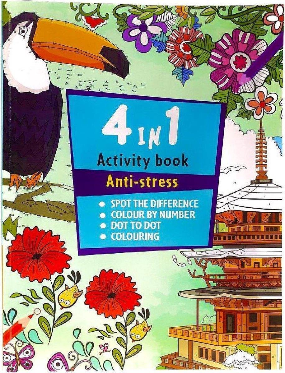 4 in 1 Activiteitenboek volwassenen - kleurboek - kleuren op nummer- zoek de verschillen - kleurplaten - punt naar punt - ANTI STRESS kleur boek dieren