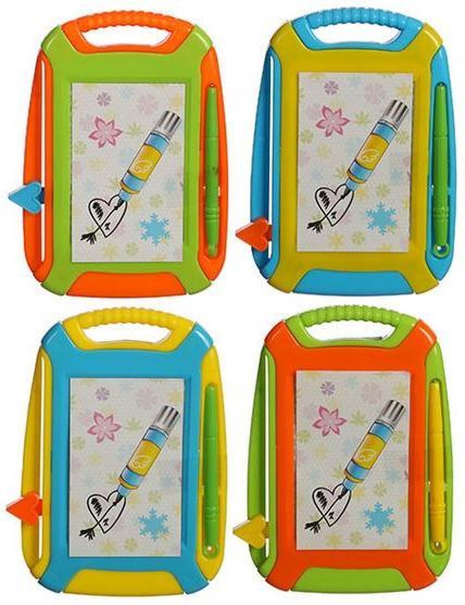 4 stuks magnetische tekenbordjes Vrolijk gekleurd magnetische tekenbordje, compleet met pen. Kleur met de pen op het witte oppervlak en maak de mooiste tekeningen. Met één veeg van de schuif maak je het oppervlak weer schoon en kun je opnieuw beginnen! Het bord heeft een stevig handvat voor goede grip. maat tekenbordje : 13.5 x 11 x 1.5cm U ontvangt 4 tekebordjes