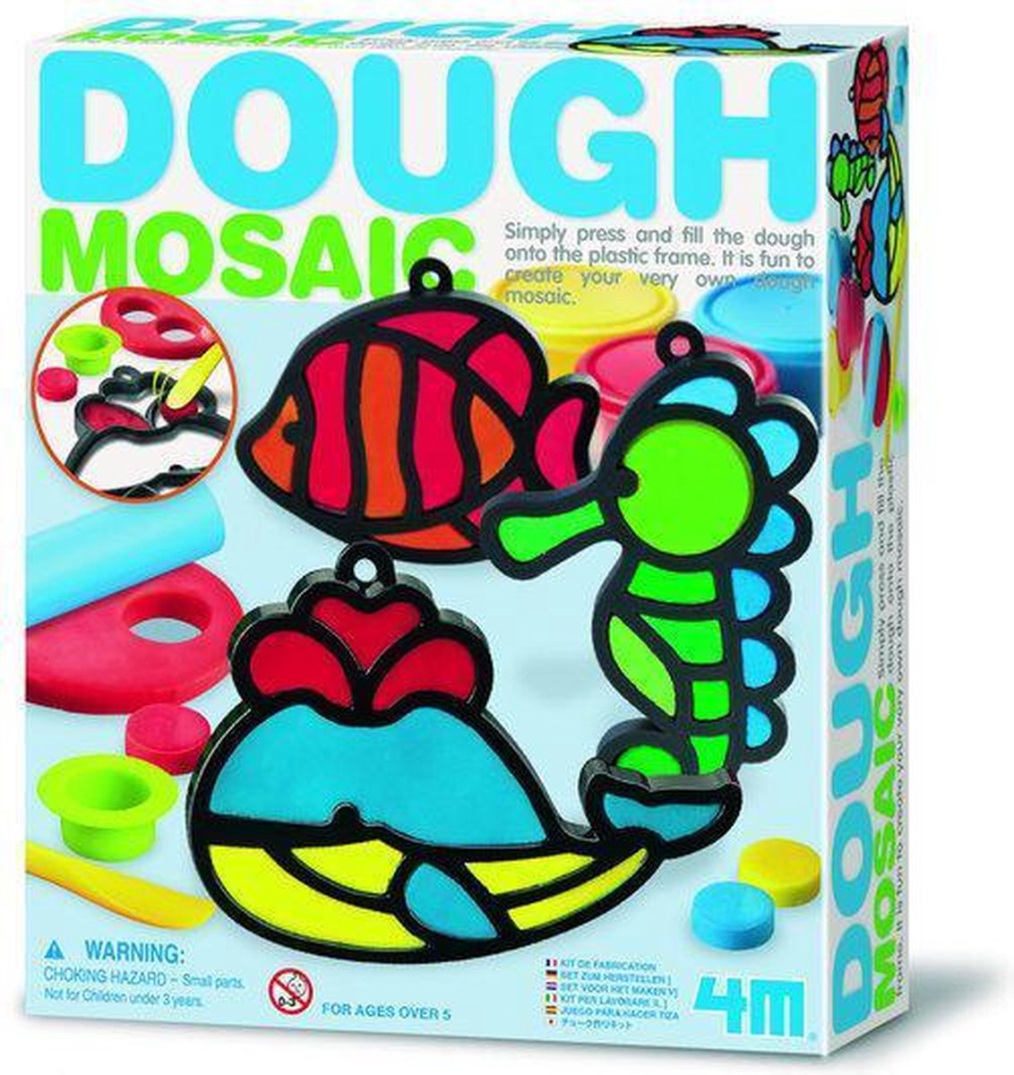 Met deze creatieve 4M Crea Art Deegmozaïek - Oceaan doos van 4M kan elke kleine kunstenaar aan de slag om de meest betoverende mozaïkjes te maken. Het is heel eenvoudig, duw het deeg in de plastic kader en hang je kunstwerk op in je kamer of geef het cadeau aan vriendjes of familie! Je kan 3 zeediertjes maken : een vis, walvis en zeepaardje.