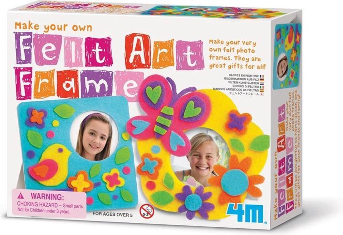 4M Crea Craft Fotokader Maak je eigen vilten fotolijsten. Prachtig als decoratie en om cadeau te doen aan vrienden en familie. Dit 4M Crea Craft Fotolijst pakket bevat genoeg materiaal om 2 fotolijstjes van 9 x 9 cm te maken. Inhoud: - 6 gekleurde en voorgesneden stukken vilt - 2 kartonnen rugkaarten - 2 papieren standaards - lijm - dubbelzijdig plakband - gedetailleerde instructies. Afmetingen doos: 18 x 14 x 6 cm Geschikt voor kinderen vanaf 5 jaar.