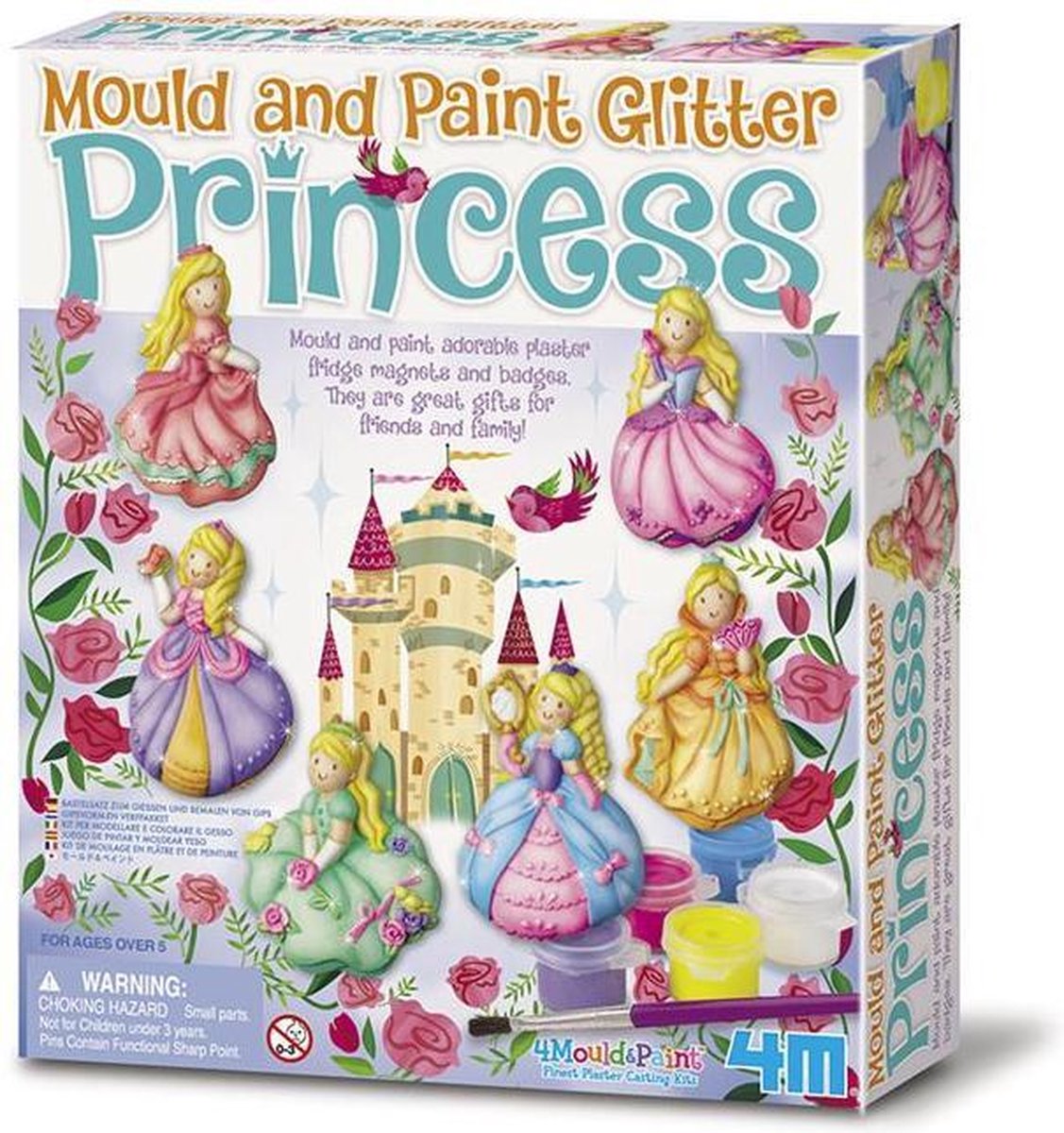 Met 4M Crea Gips Gieten en Verven - Prinses kan je zelf in gips verschillende prinsesjes maken en schilderen. Die kan je nadien op de koelkast hangen, op je kleren spelden, uitdelen aan familie en vrienden, enzovoort. Deze kit bevat gietvormen, plaaster, verf in verschillende kleuren, een penseel, magneetjes, brochepins, glitterpoeder en gedetailleerde instructies.