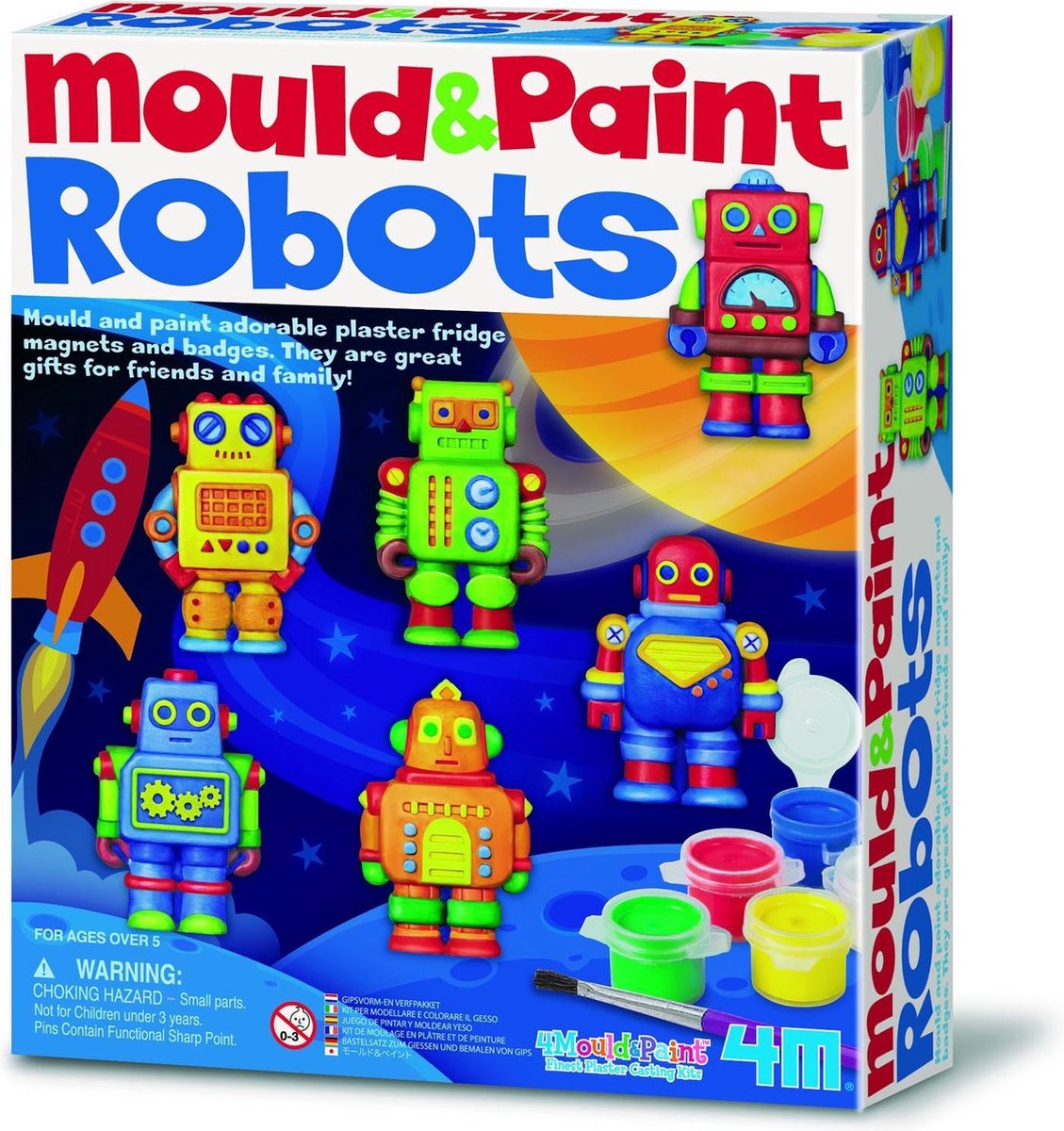 4M Crea gips gieten en verven Robots Giet leuke robotjes uit gips om ze daarna een vrolijk kleurtje te geven. Inhoud: - gietvorm met 6 figuren - plaaster - verf - penseel - magneetjes - speldjes - gedetailleerde instructies Afmeting doos: 18 x 22 x 5 cm. Geschikt voor kinderen vanaf 5 jaar.