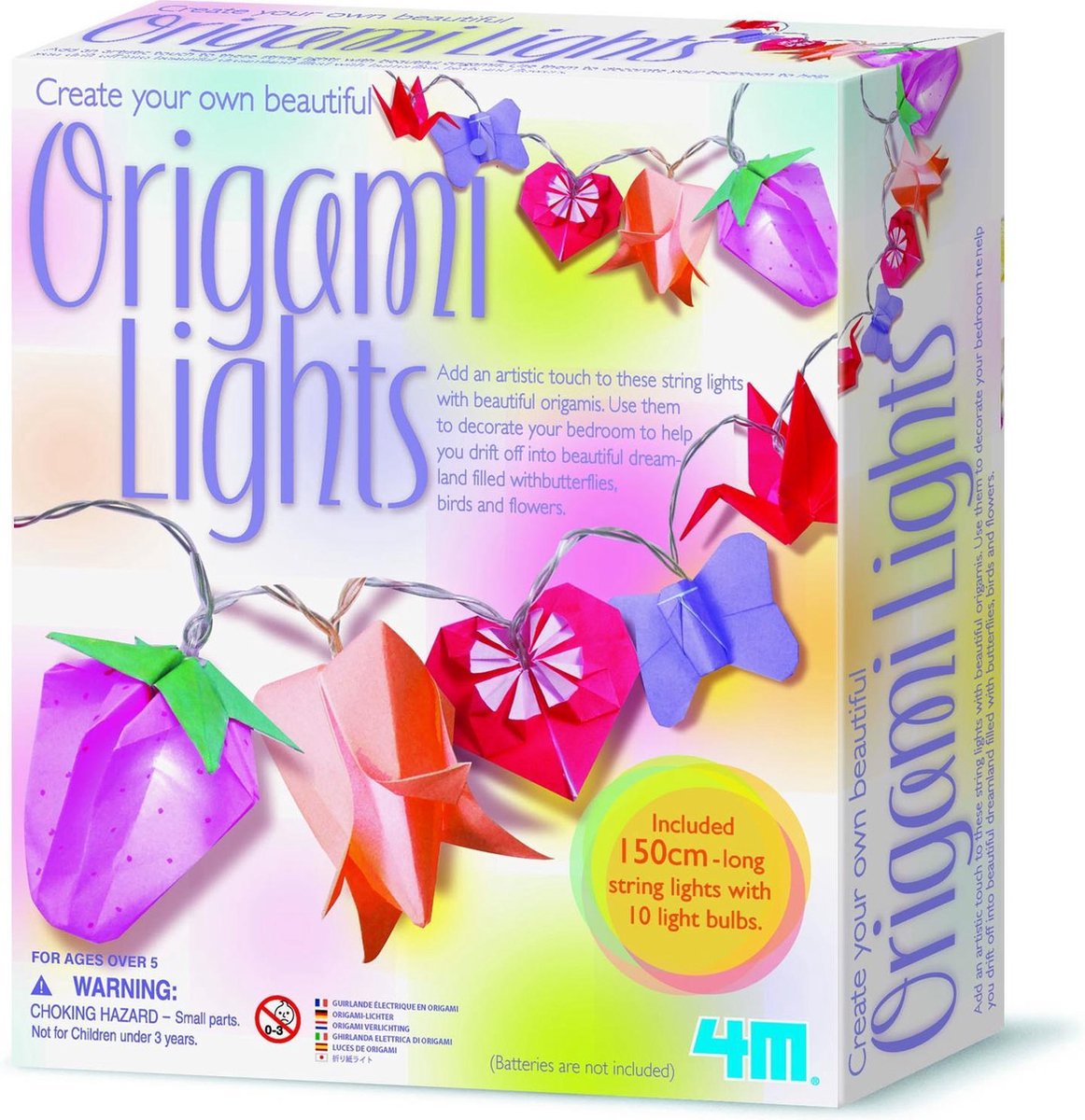 Met 4M Crea Origami Lichtjes Vouwen maak je een prachtige lichtjesslinger door zelf verschillende lichtjes in leuke vormen te maken. Dit pakket bevat 150 cm verlichtingsdraad met 10 lampjes, 10 origamiblaadjes en gedetailleerde instructies.