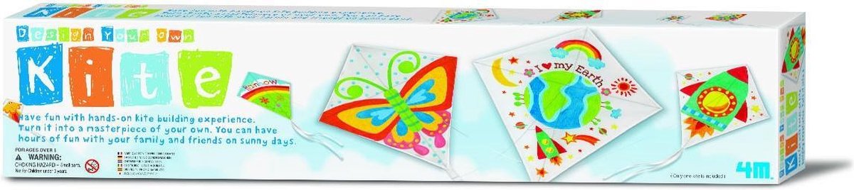 Maak je eigen vlieger met 4M Crea Schilderen - Vlieger. Je kan hem zo veel kleuren en patronen geven als je wenst! Ja kan er ook nadien op zonnige dagen met je vrienden en familie veel plezier mee maken! Deze kit bevat een vlieger (lengte 65cm, polyester), een verfstrip, waterproof, penseel, schuimrubber, sjabloon en gedetailleerde instructies.