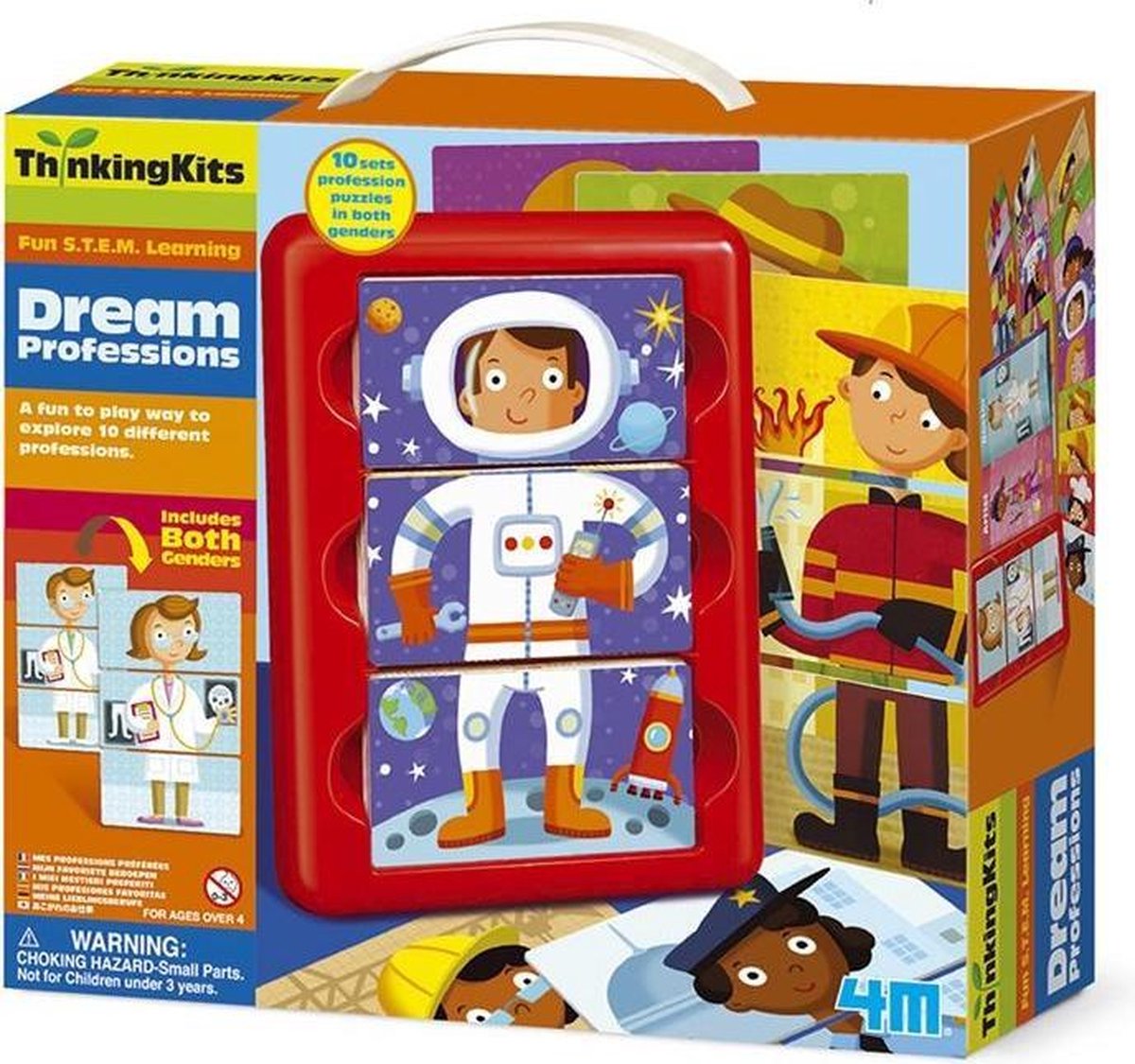 4M ThinkingKits mijn droomwerk Wat is jouw droomberoep? Zoek het uit met dit leuke spel! Een dokter, ruimtevaarder of brandweerman, doe eens gek en mix ze door elkaar. In het spel zitten mannelijke en vrouwelijke kaarten. Specificaties: Kleur: multicolor Geslacht: junior Leeftijd: vanaf 4 jaar Taal: Nederlands, Frans, Duits Materiaal: kunststof Afmetingen houder: 22 x 17 cm (L x B) Inhoud: 10 Mannelijke beroepenkaarten 10 Vrouwelijke beroepenkaarten 1 Houder Instructies