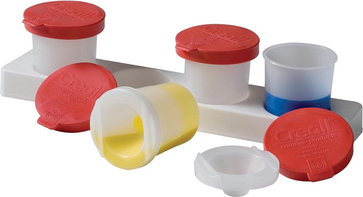Uit stevige kunststof. De breed opstaande rand aan de binnenzijde verhindert dat de verf eruit kan stromen wanneer het potje omvalt. Afsluitbaar na gebruik zodat de resterende verf kan worden bewaard. Het deksel (HA17063) sluit de antiknoeipot (HA17061) enkel af alsook de trechter (HA17062) in de pot geplaatst wordt.\\n\\nset van 4 potjes van 320 ml met rood deksel