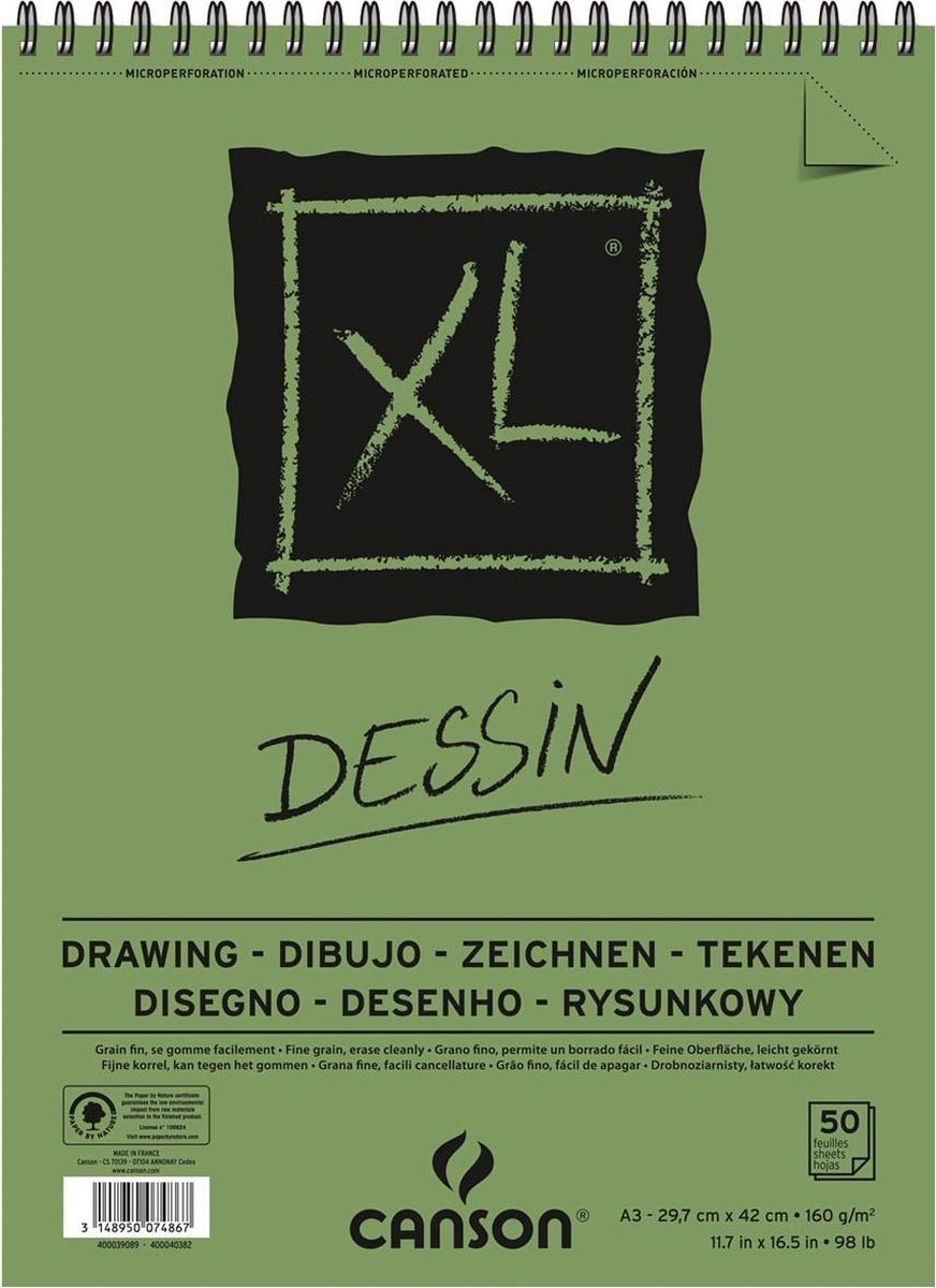Blok van 50 blad. Papier van 160 g/m². Fijne korrel, kan tegen het gommen. Voor alle technieken: potlood, pastel, houtskool en inkt. Met spiraalbinding aan de korte zijde. Met microperforatie.\\n\\nft 29,7 x 42 cm (A3)