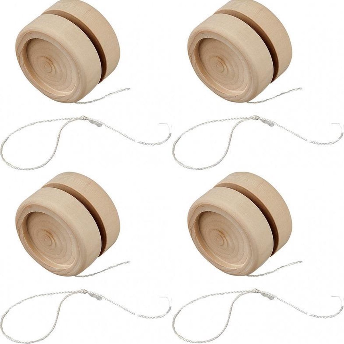 4x Jojo met wit touwtje, gemaakt van hout. Afmeting: ca. D5 x H3 cm. Doordat het hout onbehandeld is kunt u de jojo goed schilderen en/of versieren. Leuk voor bijvoorbeeld kinderfeestjes/kinderpartijtjes! U ontvangt 4 stuks. DIY knutselmateriaal/hobbymateriaal houten jojo om te versieren.