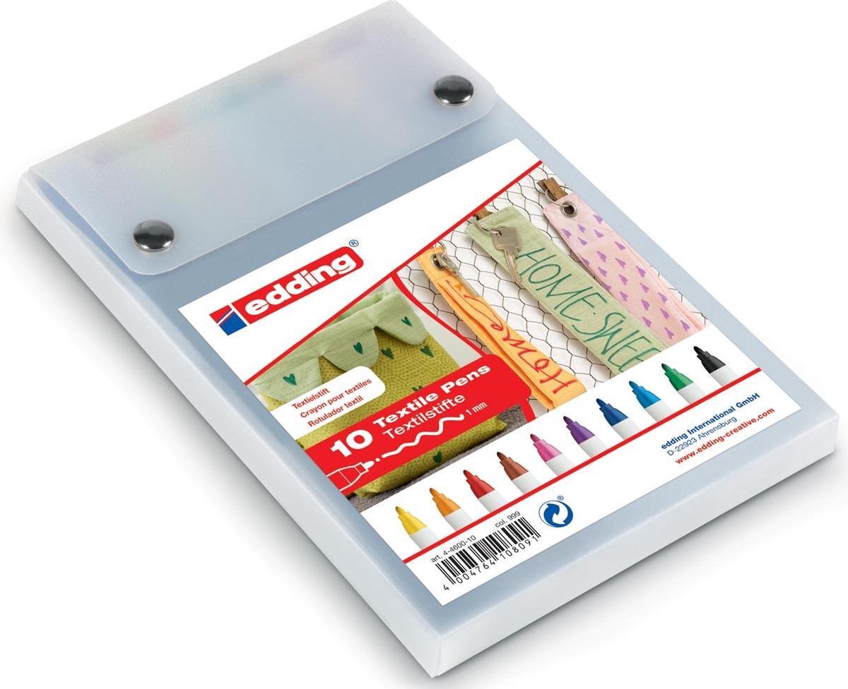 Textielstift met ronde punt met een schrijfdikte van 1 mm. Schrijfbreedte: 1 mm. Lichtbestendige, reukneutrale pigmentinkt op waterbasis. Stift voor het beschrijven en decoreren van bijna alle textielsoorten. Na het fixeren wasbestendig tot 60 °C.\\n\\ndoos van 10 stuks in geassorteerde kleuren