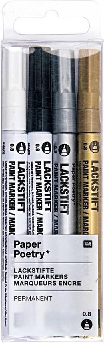 4x Luxe verf markeerstiften zilver/goud/wit/zwart 0.8 mm. Deze contourstiften zijn ideaal voor het ontwerpen en decoreren van verschillende oppervlakken, zoals cadeaupapier, kerstkaarten en verschillende DIY-projecten. De pennen hechten aan tal van oppervlakken, zoals glas, plastic, metaal, hout en porselein. Bovendien zijn de permanente, dekkende kleuren waterdicht en lichtecht en zijn ze ook geschikt voor donkere oppervlakken. Op oliebasis. Lijndikte: 0.8 mm. Kleur: goud, zilver, wit en zwart. Dekking: dekkend. Hobbymateriaal/knutselmateriaal hobbystiften metaalstiften/keramiekstiften. Glasstiften/porseleinstiften om mee te tekenen.