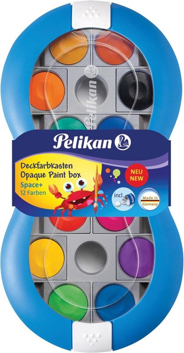 Plastic doos met 12 gekleurde napjes en 1 tube dekwit. Verfnapjes zijn uitwisselbaar. 10 extra grote mengnappen. Mengpaneel is makkelijk schoon te maken. Kleuren worden opgeborgen in het deksel om plaats te besparen.\\n\\nblauwe doos