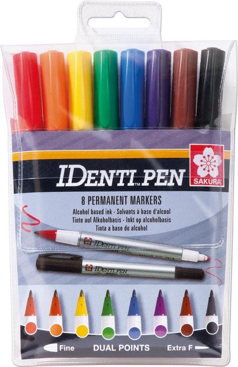 Ronde punt. Twee permanent markers in één: aan één zijde met een taaie glasvezelpunt, aan de andere zijde met een extra fijne kunststofpunt voor details. Voor intens gebruik. Zonder schudden of pompen. Geschikt voor sheets, peel-off vellen, stof, keramiek,hout, enz.\\n\\netui van 8 stuks in geassorteerde kleuren