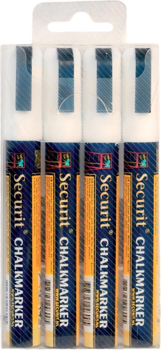 Securit originele krijtmarker met medium schuine punt van 2-6 mm. Deze krijtmarker loopt niet uit, verkleurt niet en is bestand tegen lichte regen. Te gebruiken op alle niet-poreuze oppervlakken. Afwasbaar met spons en water.\\n\\nwit, blister met 4 stuks