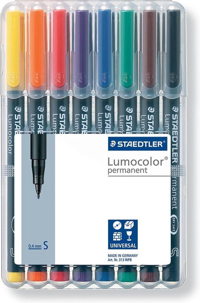 Watervaste stiften voor o.a. retroprojectie. De inkt is ontworpen om op nagenoeg alle gladde oppervlakken te schrijven: plastic, glas, porselein, diepvrieszakjes, OHP-transparanten, CD's/DVD's, enz.'Dry safe ink' technologie: kan tot 2 weken openliggen zonder uit te drogen.\\n\\ngeassorteerde kleuren, box met 8 stuks, superfijn 0,4 mm