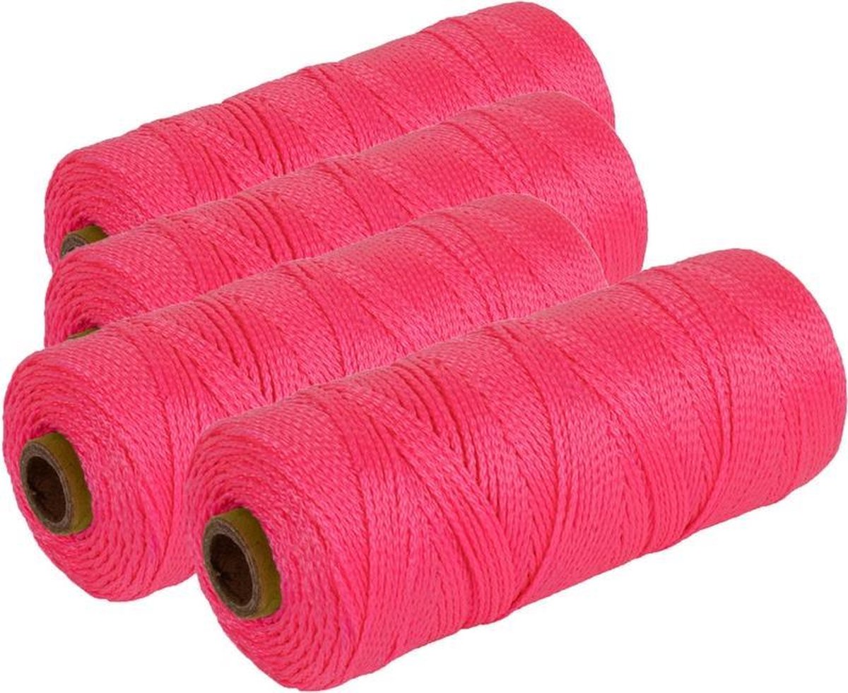 4x Touw/uitzetkoord roze. Deze uitzetdraad is ideaal voor het uitzetten van een rechte lijn bij het bestraten of het tegelen van de tuin. Met draadpennen in de grond kan het uitzetkoord bevestigd worden. De roze kleur valt extra op bij het uitzetten. Stokjes niet inbegrepen. U ontvangt in totaal 4 rollen uitzetdraad. Formaat: 1,5 mm x 200 m. Kleur: roze. Materiaal: nylon. Tuin aanleggen bestrating basismateriaal. Perkje uitzetten.