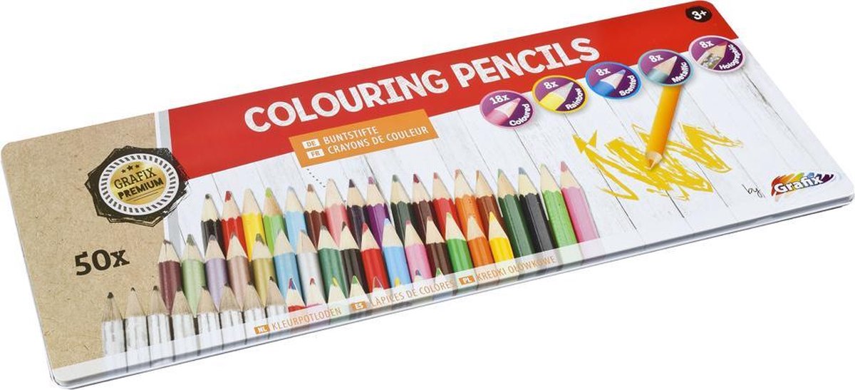 50 verschillende houten kleurpotloden in blik. Ideaal voor uren teken- en kleurplezier! Geschikt voor zowel kinderen als volwassenen. Inhoud van het product: - 18 kleurpotloden - 8 regenboog potloden - 8 potloden met geur - 8 metallic potloden - 8 holografische potloden Afmetingen potlood: 17,5 x 0,7 x 0,7 cm. Afmetingen verpakking: 48 x 18 x 1,5 cm.